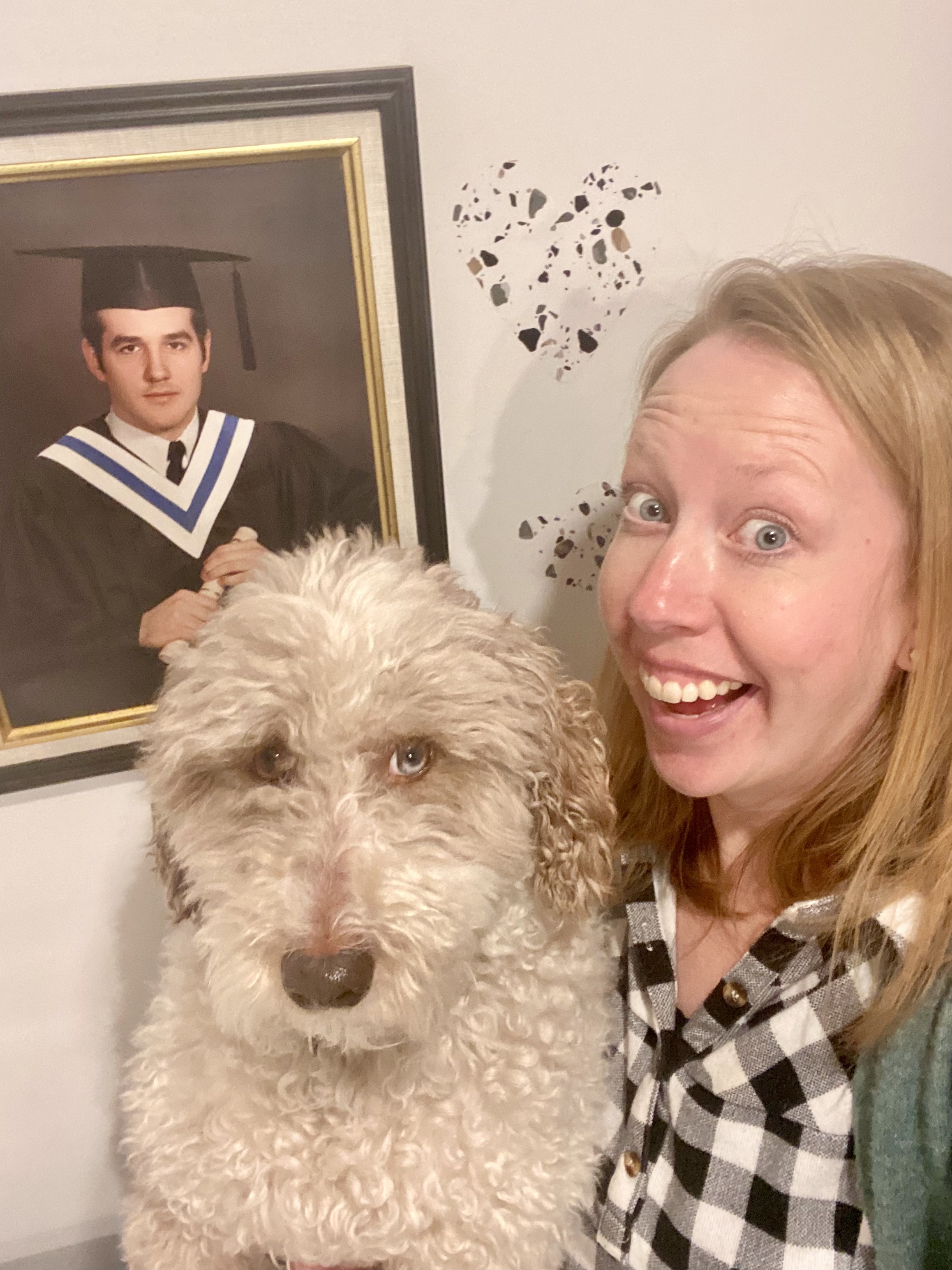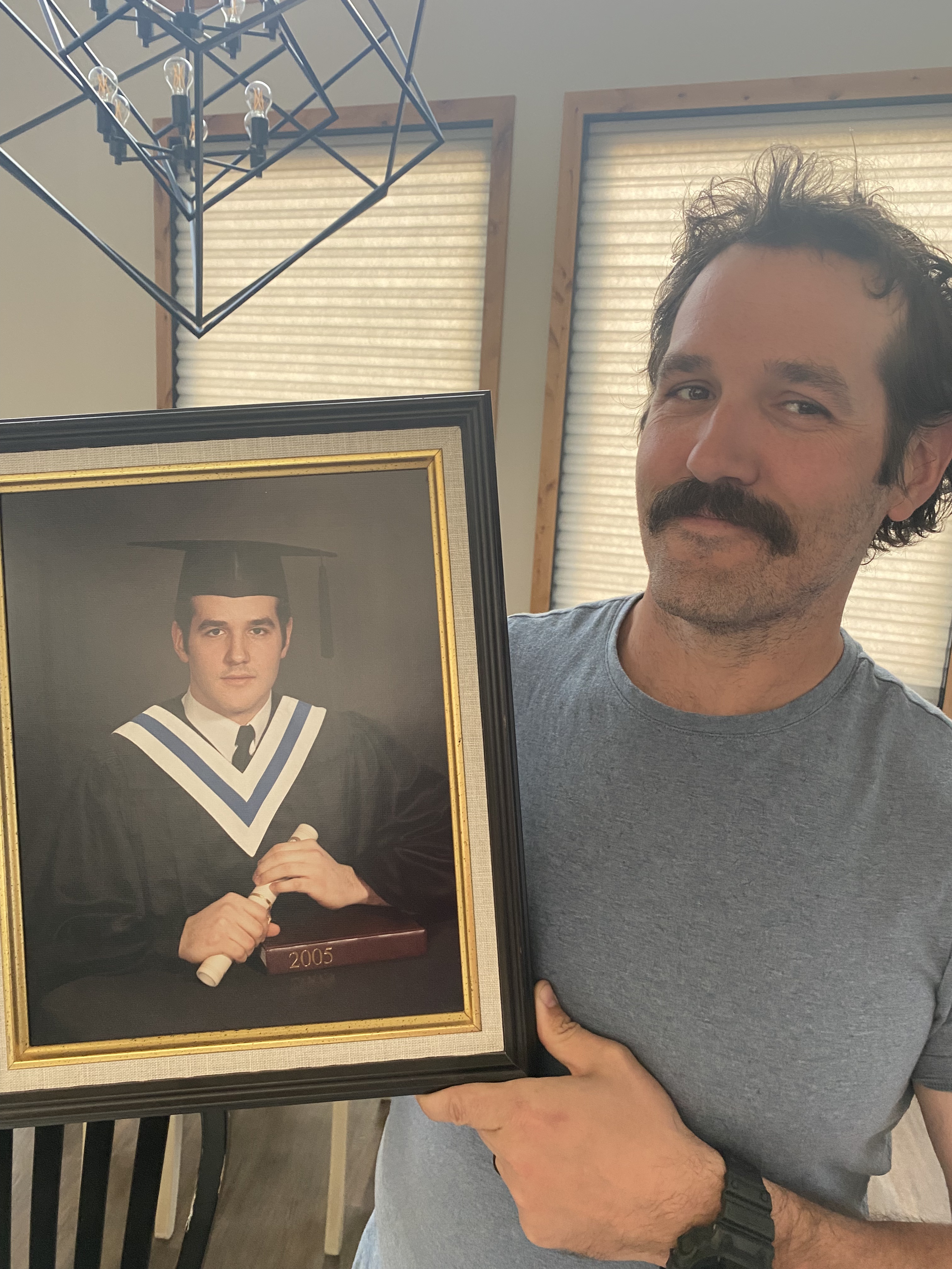 I got Tom to pose next to his grad photo, the other evidence we had of his shaven chin. (Anyone who stayed at our old place may have been treated to a viewing of this grad photo – when Tom moved in he was giving me a hard time about not hanging up his things, so I hung this behind the door in our spare bedroom. You didn’t see it until you closed the door to hop into bed. A cute high school Tom to send you off to sweet dreamland. In our current house, I once again got a hard time that the grad picture wasn’t part of the decor. I hung it up in the laundry room one weekend when Tom was away working – he was honoured to have it hanging up again, right by his favourite chore nonetheless!)